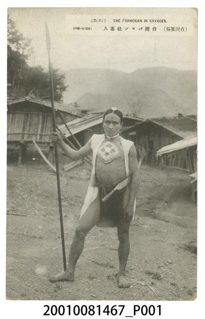 本件是以泰雅族巴陵社男子為主題之黑白明信片,背景為竹木搭建的房屋。男子頭髮中分後束,頭頂處綁繫圓形貝片頭帶,上額及下巴處帶有長條平行紋痕,脖子佩帶貝珠頸飾,上身著胸兜外罩無袖白上衣,下身穿遮陰布,左腰際配刀,右手持長矛。「巴陵」(Baron或Balong)源自泰雅語,意指檜木或巨⽊。巴陵社位於桃園縣復興鄉拉拉⼭⼀帶,為泰雅族⼤嵙崁群聚落。明信片正面上方印刷文字「台北 山一發行」以及「(台灣風俗)台灣バロン社蕃人 THE FORMOSAN IN SAVAGES (D.31)」。明信片背面右上角方框為郵票黏貼處,中央有道分隔線,其餘空白處印刷文字「郵便はがき POST CARD」。