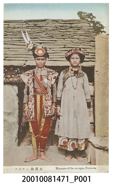 本件是以排灣族男女為主題之彩色明信片,其正面為男女並肩而立的全身照片,依據穿著推測為頭目或貴族階級夫婦。左圖男子頭插鷹羽與太陽紋飾,上身著對襟圓領長袖長上衣,外套雲豹皮背心,下身著短裙,短裙外加穿紅黃相間後敞褲。右圖女子頭纏頭帕,脖子上配戴貝片頸飾與琉璃珠胸飾,上身著右襟圓領長袖連身長衣,長衣內側加穿長裙與護腳布。照片底端印刷文字「バイワン族男女 Manners of the savages, Formosa.」。明信片背面右上角方框為郵票黏貼處,其餘空白處印刷文字「郵便はがき POST CARD」。