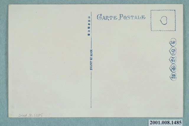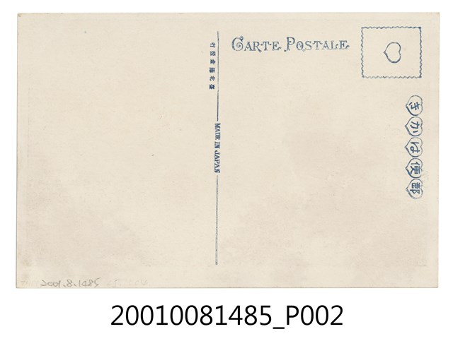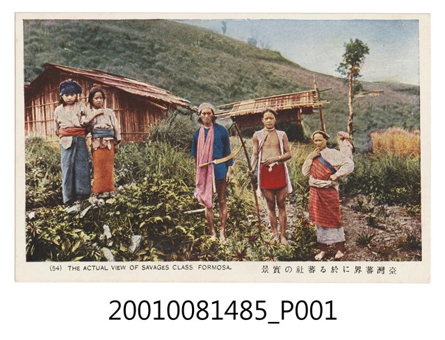 本件是以原住民生活情景為主題之彩色明信片。左圖中兩名孩童身著平埔族服飾,右圖中三名成人服裝形似泰雅族,拍攝地點位於番界附近。照片下方印刷文字「臺灣蕃界に於る蕃社の實景 (54) THE ACTUAL VIEW OF SAVAGES CLASS FORMOSA.」。明信片背面右上角方框為郵票黏貼處,中央分隔線標以文字「MADE IN JAPAN」,其餘空白處印刷文字「郵便はかき CARTE POSTALE」以及「臺北藤倉發行」。