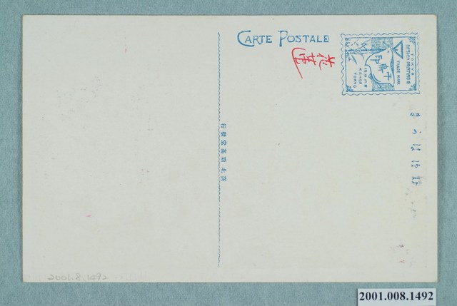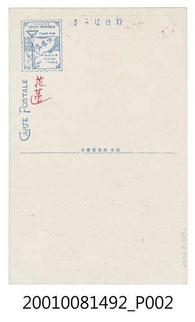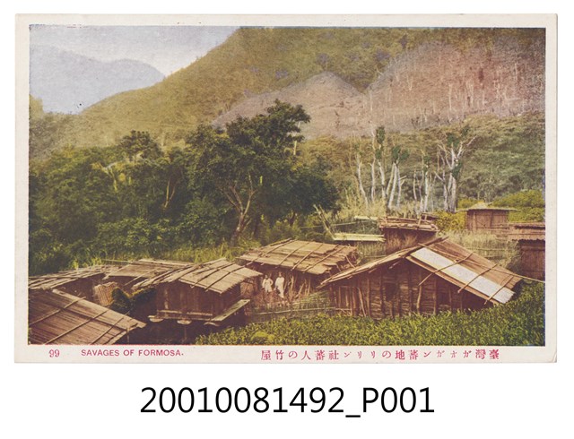 1. 本件是以原住民的住屋為主題之有色印刷明信片,圖片影像背景為遠山,中景為樹林,前景為竹屋,竹屋前方站著兩名原住民。明信片正⾯底邊印刷⽂字「臺灣ガオガン蕃地のリリン社蕃人の竹屋 SAVAGES OF FORMOSA. 99」。明信片背⾯為空白書寫面,右上角藍色方框為郵票黏貼處,方框內有竹葉加鳥型商標圖示,以及「TOKYO DESIGN PRINTING Co.,TRADE MARK,千⿃印,登錄商標,KANDA TOKYO」等字樣,方框旁有以紅筆書寫的「花蓮」兩個字。背面中央有道分隔線標有「臺北 新高堂發行」,其餘空白處印刷文字「「郵便はがき CARTE POSTALE」。2. Gaogan番(卡奧灣)在文獻上記載為合歡群或高崗群,日本時代⼜稱為⼤嵙崁後⼭蕃或是⾼岡蕃,是屬於泰雅族的部落,其位置大約是在今日的桃園縣復興鄉。