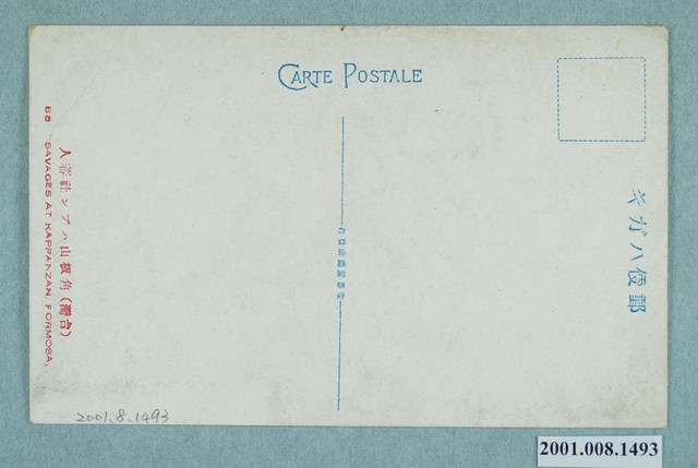 1. 日本時代有色印刷明信片,圖片影像為7名泰雅族青年圍坐在火堆周圍,最右之男子為站姿,腰際配掛一把彎刀,眾人後方有一竹木搭建的穀倉。明信片正面無印刷文字;背面印刷藍色文字:「郵便ハガキ 生蕃屋商店發行 CARTE POSTALE」;印刷紅色文字:「(台灣)角板山ハブン社蕃人 88. SAVAGES AT KAPPANZAN, FORMOSA」,其餘空白。
