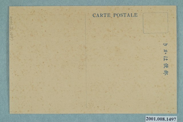 2. 明信片正面上方印有2個藍紫色戳記,左側為櫻花形日月潭山水圖,戳記內文字:「臺灣 水社 日月潭」;右側為邵族擊杵圖形,戳記內文字:「日月潭遊覽記念」;底邊藍色印刷文字:「(臺灣八景) 日月潭畔蕃家ノ杵聲 臼井寫真館發行」右下角另有「臺灣所見」四字。背面印刷藍色文字:「郵便はかき,CARTE POSTALE」,其餘空白。