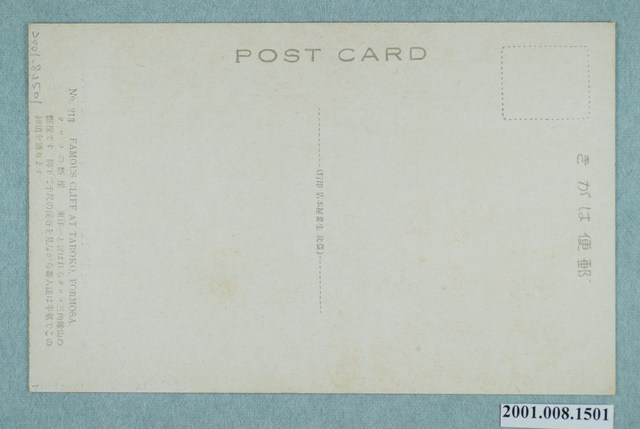 2.正面影像滿版印刷,無文字。背面印有灰色文字「郵便はがき、POST CARD、(臺北 生蕃屋本店印行)」,以及說明文字「No. 213 FAMOUSE CLIFF AT TAROKO, FORMOSA.、タロコの斷崖、東洋一と言はれるタロコ三角錐山の斷崖です、腳下二千尺の溪谷を見なから蕃人達は平氣でこの細道を通ります。」(譯:可稱為東洋第一的太魯閣三角錐山的斷崖,雖然看著腳下深達二千尺的溪谷,原住民們卻能平心靜氣地行走在狹窄的山徑上。)