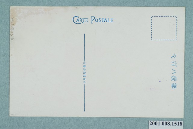 1. 本件是以原住民婦女為主題之明信片,其正面為2名並肩而立的泰雅族婦女照片。左圖女子較為年輕,頭包頭⼱,面部無紋面,⾝穿漢式長袖上衣,自左肩至右腋下斜掛披肩。右圖女子較為年長,頭髮中分綁繫頭帶,臉上帶有額紋以及V字型頰紋,口中叼著長煙斗,身穿長袖上衣,⾃右肩至左腋下斜掛披肩,腿套護腳布,背後有一大塊布條,似乎正在背負重物,布條打結固定於頭頂處。照片背景為竹屋以及放置於地上的兩個陶壺。照片上方蓋有藍色圓形戳章,戳章內寫有「⾓板⼭登⼭記念」字樣以及山林的圖像。明信片上方印刷文字「(台灣)角板山蕃婦(重荷ノ運搬)01. SAVAGE WOMAN CARRING HEAVY PACKAGE KAPPANZAN FORMOSA.」。明信片背面右上角方框為郵票黏貼處,中央分隔線標以「生蕃屋商店發行」,其餘空白處印刷文字「郵便ハガキ CARTE POSTALE」。2. 角板山位於今日的桃園縣復興鄉,境內居民多為泰雅族。