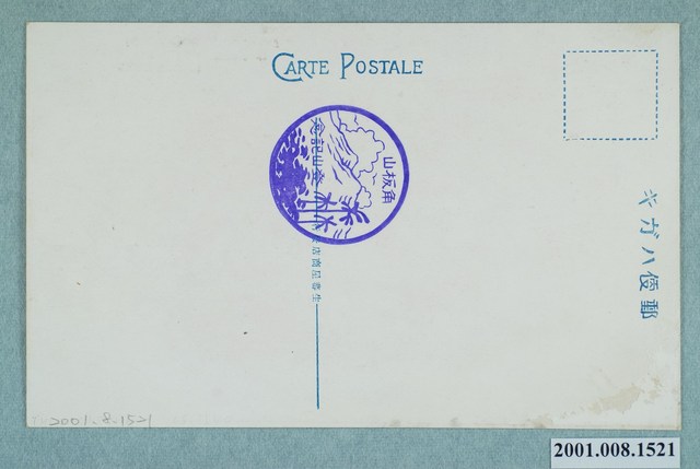 1. 日本時代有色印刷明信片,圖片影像為一泰雅族男子坐在竹木搭建的穀倉前台上。明信片正面左下角有白色磨損,右上方印刷文字:「(台灣)角板山ハブン社蕃人ノ穀倉 89. STOREHOUSE OF SAVAGE, KAPPANZAN, FORMOSA」(中譯:臺灣角板山哈盆社原住民的穀倉)。背面印刷文字:「郵便ハガキ 生蕃屋商店發行 CARTE POSTALE」,中央偏上蓋有一藍紫色圓形「角板山登山記念」戳章,其餘空白。