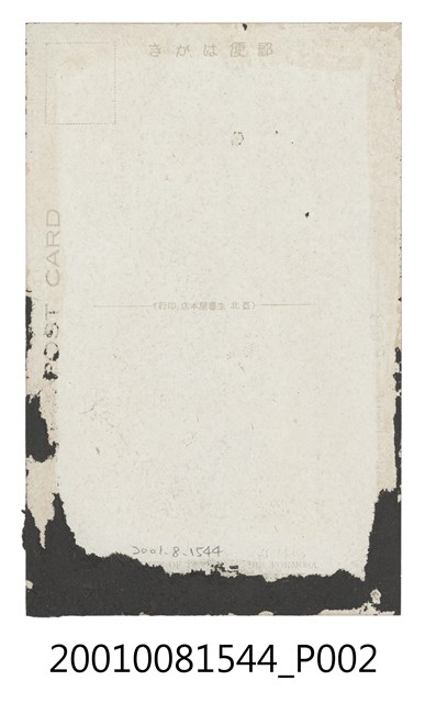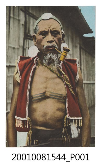 1. 本件是以臺灣原住民為主題之明信片,其正面為男子抽煙半身照。男子頭綁貝片頭帶,雙耳穿蕈狀貝片耳飾,嘴裡叼著煙斗,身著無袖紅色上衣,斜背煙草袋,左腰間配刀,下身著遮陰布,胸口紋有三條左右對稱平行紋。明信片背面為空白書寫處,右上角方框為郵票黏貼處,中央分隔線標有「(臺北 生蕃屋本店 印行)」,其餘空白處印刷文字「郵便はがき POST CARD」。2. 此張照片由瀨川孝吉攝於1935年,照片中的人物為北賽夏族群大隘社頭目Taro’ a ‘Oemaw(漢名為趙明政)。紋身是賽夏族重要的生命禮俗,含有特別的社會意義。只有經歷多次獵首的男子,才有資格於肋骨左右各刺三道平行紋飾,用以表彰獵人英勇無畏的精神以及出眾的能力。