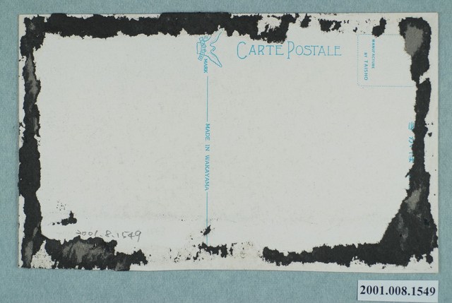 1.本物件為以屏東蕃屋為主題之明信片,正面為蕃屋彩色圖像,畫面中可見2棟石板屋,其中1棟門前有1石器,1名女子抱膝坐姿,另1名則站立,右下有2段文字,第1段「SAVAGES' HOUSES OF HEITO, TAIWAN.」,第2段「(臺灣)屏東 番屋」,左下有1段文字「この蕃屋は南部蕃人の家屋をそのま□模して建てたもので,山地に住む蕃人達が屏東の市街を訪れると一夜の宿を此處に求める」,大意為這番屋為模仿南部原住民加屋所建,山地原住民至屏東市街時借宿於此;其背面為空白明信片直式書寫面,以藍色單色印刷,左上有郵票黏貼處,有1段文字「MANUFACTURE BY TAISHO」,上方有「郵便はかき」字樣,左側有「CARTE POSTALE」字樣與商標圖案,該圖案有「TRADE MARK」字樣,中央有「MADE IN WAKAYAMA」字樣。