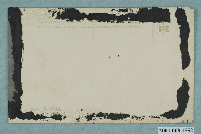 本件是以臺灣原住民為主題之明信片,其正面為織布中的泰雅族婦女照片。女子坐在家屋內鋪在地板的席子上,雙手使用織布機正在織布,後方有1名男子正在觀看織布的情景,背景是以木板和石板砌成的牆面。明信片正面頂端印刷文字「機を織る女(タイヤル族)」。明信片背面為空白書寫面,因邊緣有不明黑體覆蓋致使部分文字消失。右上角方框為郵票黏貼處,中央有道T型分隔線左右各標以文字「This Space may be used for Communication」以及「The Address Only to be Written Here」,分隔線上方印刷文字「 PUBLISHED BY KATSUYATA PHOTO STUDIO 2-CHOME. AKASHIMACHI. TAIPEH」(中譯:臺北勝山寫真館發行)。