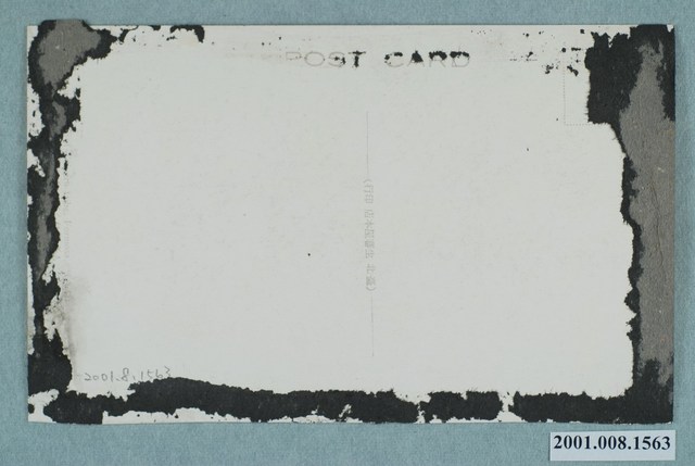 1. 本件是以臺灣原住民住屋為主題之明信片,其正面影像為8名泰雅族原住民於家屋前的照片。圖中左側為遠處的平地竹屋,右側為木頭及茅草搭建而成的半豎穴式家屋,家屋上坐著3名男童,旁邊斜靠的梯子上坐著1名婦女,2名男子坐在梯子旁的地上,最左側站有2名孩童。照片中的婦女及男子皆穿著泰雅族傳統服飾,小孩則穿著日式服裝。明信片正面無任何印刷文字說明,背面為空白書寫面,因邊緣有不明黑體覆蓋致使部分文字消失。右上角方框為郵票黏貼處,中央有道分隔線標有「臺北 生蕃屋本店 印行」,中央上方空白處印刷文字「POST CARD」。2. 照片中的泰雅族人屬於南勢群博愛等社,又稱作Kulas社或Timburan社,其位置大約位在今日的臺中縣和平鄉博愛村。