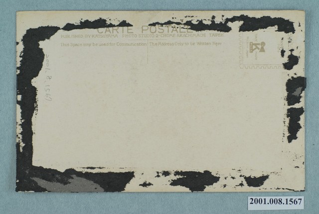 1. 本件是以原住民婦女拿杵搗小米為主題之明信片,其正面影像為3名泰雅族女子站在房屋前方,雙手持木杵作搗米狀。明信片正面右上角印刷文字「粟を搗く娘達(タイヤル族)」。明信片背面為空白書寫面,因邊緣有不明黑體覆蓋致使部分文字消失。右上角方框為郵票黏貼處,方框內由上至下印刷「Place Postage 、TRADEMARK、P.S.C.L.、Made in Japan」以及K字型圖示。中央有道T型分隔線左右各標以文字「This Space may be used for Communication」以及「The Address Only to be Written Here」,分隔線上方印刷文字「CARTE POSTALE」以及「 PUBLISHED BY KATSUYATA PHOTO STUDIO 2-CHOME. AKASHIMACHI. TAIPEH」(中譯:臺北勝山寫真館發行)。2. 照片中的泰雅族婦女屬於Masitoban社,中文名稱為瑞岩社,位於今日的南投縣仁愛鄉發祥村。