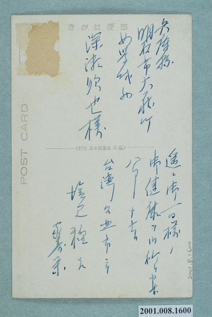 1.本物件為以木瓜田為主題之明信片,正面有木瓜田彩色圖像,畫面中可見棵顆木瓜樹筆直生長,且樹上皆有圓厚的木瓜,應為木瓜田之一隅,上方有3段文字,第1段「(臺灣)木瓜畑」,第2段「Papaya-trees, Formosa.」,第3段「臺灣風景に特色を添へる植物の一つで一本の幹に數十の實が密集して居るのは誠に見事てあります」,其大意為其1棵棵樹幹上結實數十顆緊密相連,為臺灣的特色風景;背面為空白明信片直式書寫面,以黑色單色印刷,左上為郵票黏貼處,上方有「郵便はかき」字樣,左側有「POST CARD」字樣,中央有「臺北生蕃屋本店發行」字樣,上方寫有收件地址,僅能辨識為「兵庫縣明石市大花町」,下方有簡單的文句描述,但無法辨識字跡。