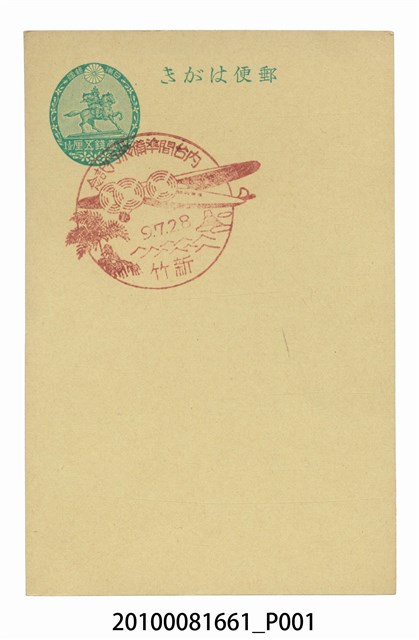 1. 本物件為蓋有日本臺灣間準備飛行紀念章之明信片,以綠色單色印刷,左上方印有1橢圓形圖樣,文字由上至下為「日本郵便」、「N.S壹錢五厘1½」;圖樣由上至下為菊花,穿著盔甲的騎馬武士,以及3朵櫻花;明信片上方有「郵便はがき」 ,中央偏左上位置蓋有1暗紅色圓形戳章,文字由上至下為「內台間準備飛行記念」、「9.7.28」(昭和9年7月28日)、「新竹」,戳章圖樣為1架有3個螺旋槳的飛機,右下角為富士山圖樣,左下角為棕櫚科植物圖樣;背面為一片空白。2. 大正12年(1923)8月22日一架警察航空班飛機將屏東的信件送到臺北,開啟了臺灣島內「飛行郵便」的首例,西元1930年總督府召開的「臨時產業調查會」中,討論了臺灣航空之議題,包含航線實況精查、規劃,國際機場設置,以及全島各地的航空無線電信及航空標誌設置,並於1934年進行「內臺準備飛行」計畫,其成果良好,遂開啟1935年的內臺定期郵便航空。
