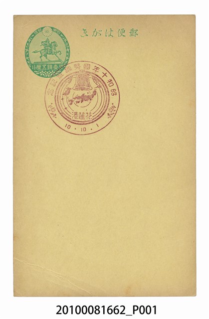 1.本物件以國勢調查為主題,彩色樣式。正面左上角有一綠色橢圓形郵票處,該處有一戰士騎乘馬的圖像,且可見「日本郵票」、「壹錢五厘」等字樣。上方以漢字、平假名書寫之「郵便はがき」。明信片左上方有一深紅色圓形戳章,有鈴鐺及地圖的圖示,可見「昭和十年國勢調查記念」、「花蓮港」「10.10.1」等字樣。背面全部空白。2.國勢調查是針對人口異動及遷徙所作的人口普查。臺灣的第一次人口普查於1905年(明治38年),該次由於戰爭影響,僅在臺灣施行,稱為「臨時臺灣戶口調查」。日本政府第一次的國勢調查在1920年(大正9年)施行,之後每五年辦理一次。