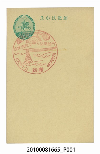 1. 本物件為蓋有臺灣電話開通紀念章之明信片,正面以綠色單色印刷,左上方印有1橢圓形圖樣,文字由上至下為「日本郵便」、「N.Sㄧ錢五厘1½」;圖樣由上至下為菊花,騎馬的武士,以及3朵櫻花;明信片上方有「郵便はがき」 ,左側偏上位置蓋有一紅色圓形戳章,文字由上至下為「內台電話開通記念」、「昭和九年」(西元1934年 )、「嘉義」、「六月二十日」,上方有轉盤電話機圖樣,中央為高壓電塔及電線插圖。背面全部空白。2. 日治時期臺灣電話的使用規定大致參照日本國內之規定;臺灣第一臺電話於西1897年架設,主要供軍隊及政府官員使用,直至西元1900年7月在臺北、臺中、臺南、基隆、斗六五地裝設電話交換機,開放市內電話業務,及民眾電話申請及開通。西元1932年遞信部為解決逐年增加的電話需求,以及已申請但未開通的部分,發布「臺灣電話特別開通規則」,以使用者付費的方式實行。