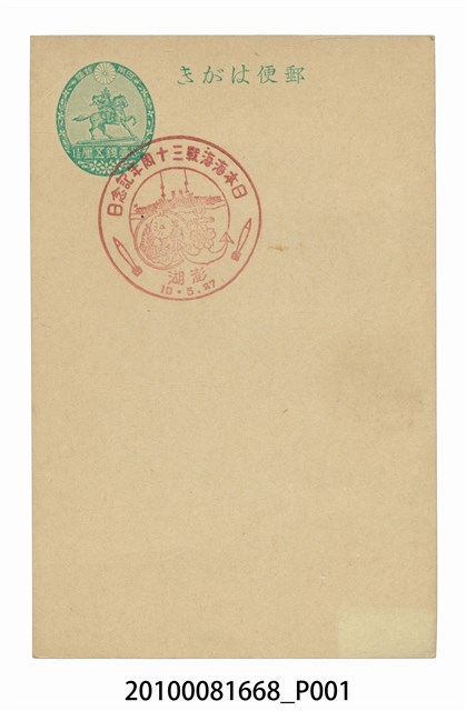 1. 本物件為蓋有日本海海戰三十周年紀念日戳章之明信片,以綠色單色印刷,左上方印有1橢圓形圖樣,文字由上至下為「日本郵便」、「N.S壹錢五厘1½」;圖樣由上至下為菊花,穿著盔甲的騎馬武士,以及3朵櫻花;明信片上方有「郵便はがき」 ,中央偏左上位置蓋有1紅色圓形戳章,文字由上至下為「日本海海戰三十周年記念日」、「澎湖」、「10.5.27」(昭和10年5月27日),戳章上方位置圖樣可能為輪船,右下方為有櫻花圖樣之船錨,左下方為1圓形圖樣,內由花朵、葉子組成,兩側各有1疑似魚雷之圖樣;背面為一片空白。2. 日本海海戰又稱為「對馬海戰」或「對馬海峽海戰」,為西元1905年日本與俄羅斯兩國在日本與朝鮮半島間之對馬海峽進行的海戰;兩方分別為日本海軍將領東鄉平八郎的聯合艦隊,以及俄羅斯海軍中將羅傑斯特文斯基(Zinovy Petrovich Rozhestvensky)的第二太平洋艦隊,此一戰役俄羅斯於羅傑斯特文斯基負傷被俘後,由俄羅斯第三艦隊司令涅鮑加托夫(Nikolai Ivanovich Nebogatov)海軍少將投降。