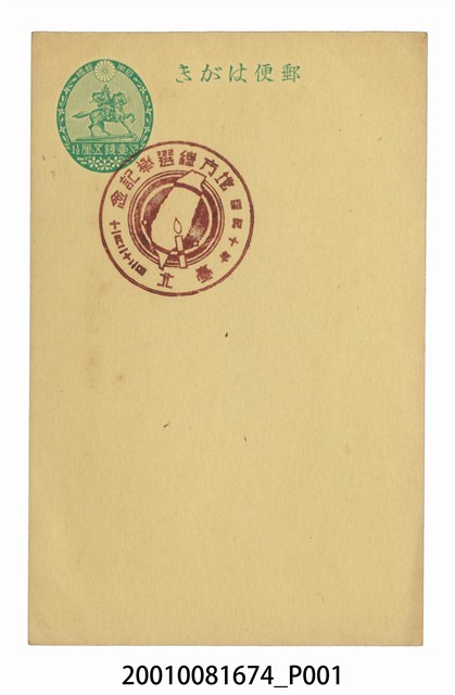 1. 本物件為蓋有地方總選舉臺北紀念戳章之明信片,以綠色單色印刷,左上方印有1橢圓形圖樣,文字由上至下為「日本郵便」、「N.S壹錢五厘1½」;圖樣由上至下為菊花,穿著盔甲的騎馬武士,以及3朵櫻花;明信片上方有「郵便はがき」 ,中央偏左上位置蓋有1暗紅色圓形戳章,文字由上至下為「地方總選舉記念」、「昭和十年」、「臺北」、「十一月二十二日」,戳章圖樣中央為臺灣島嶼之輪廓,並有1根點燃的蠟燭圖樣;背面為一片空白。2. 西元1930年蔡培火、林獻堂以地方自治為目標,籌組臺灣地方自治聯盟,主張以普選方式賦予臺灣民眾公民權,在當時臺灣的社會氛圍下,中川總督於1933年向日本拓務省提出臺灣地方自治改革草案,主張在地方制度中賦予臺灣人民有限度的地方議會選舉權,並於1935年2月14日由日本眾議院通過實行。