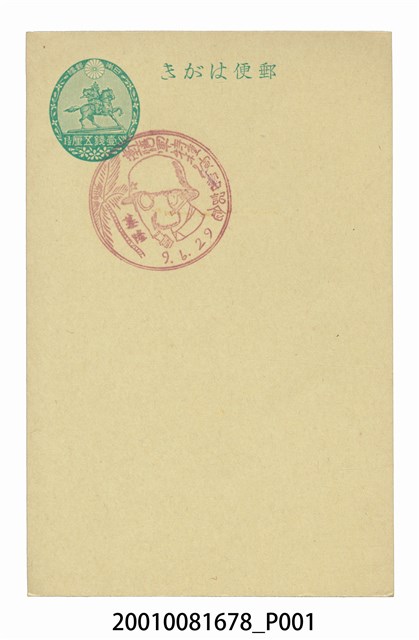 1. 本物件為蓋有臺灣軍特種演習基隆紀念戳章之明信片,以綠色單色印刷,左上方印有1橢圓形圖樣,文字由上至下為「日本郵便」、「N.S壹錢五厘1½」;圖樣由上至下為菊花,穿著盔甲的騎馬武士,以及3朵櫻花;明信片上方有「郵便はがき」 ,中央偏左上位置蓋有1紅色圓形戳章,文字由右至左為「臺灣軍特種演習記念」、「9.6.29」(昭和9年6月29日)、「基隆」,戳章中央圖樣為1名戴著有星形標誌軍用鋼盔、臉上覆蓋有防毒面具之軍人側臉,左側有1棵棕櫚科植物;背面為一片空白。2. 臺灣防空知識的傳播及演習主要起始於第一次世界大戰後,西元1931年開始臺灣幾乎每年都有舉辦防空演習的訓練,而1934年6月24日至6月29日舉行的臺灣軍特種演習,為一次大規模演習,範圍涵蓋北臺灣,包含基隆、臺北、新竹等地,其演習內容分為3個部分:本演習、附帶演習、防護演習;本演習為臺北州與新竹州北臺灣軍的共同操演,附帶演習為軍隊的實彈射擊訓練,防護演習則與民眾較具有直接關聯,包含警報傳達及防護演習等。