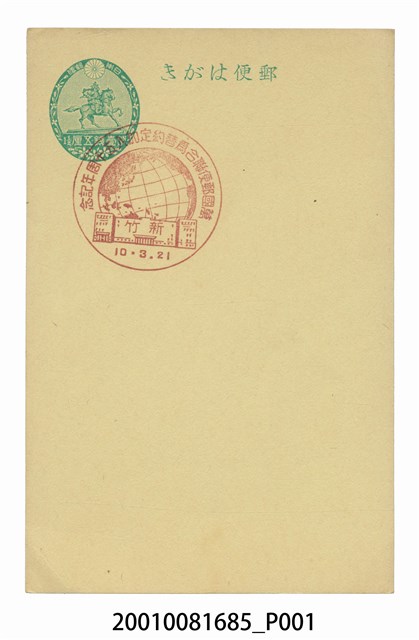 1. 本物件為蓋有萬國郵政聯盟加入五十週年新竹紀念戳章之明信片,以綠色單色印刷,左上方印有1橢圓形圖樣,文字由上至下為「日本郵便」、「N.S壹錢五厘1½」;圖樣由上至下為菊花,穿著盔甲的騎馬武士,以及3朵櫻花;明信片上方有「郵便はがき」 ,中央偏左上位置蓋有1紅色圓形戳章,文字由上至下為「萬國郵便聯合為替約定加入五十周年記念」、「新竹」、「10.3.21」(昭和10年3月21日),戳章中央圖樣為1繪有經緯線以太平洋為中心之地球,右側為北美洲、南美洲;左側為日本、澳洲、歐亞大陸;下方有1棟左右對稱,中間插有旗幟之建築物;背面為一片空白。