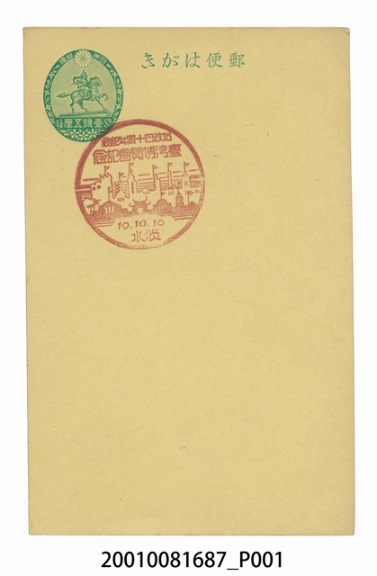 1.本物件以始政博覽會為主題,彩色樣式。正面左上角有一綠色橢圓形郵票處,該處有一戰士騎乘馬的圖像,且可見「日本郵票」、「壹錢五厘」等字樣。上方以漢字、平假名書寫之「郵便はがき」。明信片左上方有一紅色圓形戳章,有六棟建築物上頭插有旗幟、棕櫚樹、中式燕尾屋脊之圖像,可見「始政四十周年記念臺灣博覽會記念」、「10.10.10」、「淡水」等字樣。背面全部空白。2.始政四十年紀念臺灣博覽會為西元1935年10月至11月共50日的博覽會,舉辦地點以臺北為主,為宣傳其統治的政績,及臺灣各項政策的成果,主要分為4個會場,第一會場於臺北公會堂附近,第二會場於今二二八公園,第三會場於迪化街附近,第四會場於陽明山,而各地政府也各自舉辦小規模的展覽和活動。