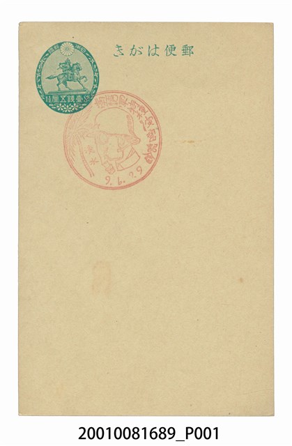 1. 本物件為蓋有臺灣軍特種演習淡水紀念戳章之明信片,以綠色單色印刷,左上方印有1橢圓形圖樣,文字由上至下為「日本郵便」、「N.S壹錢五厘1½」;圖樣由上至下為菊花,穿著盔甲的騎馬武士,以及3朵櫻花;明信片上方有「郵便はがき」 ,中央偏左上位置蓋有1紅色圓形戳章,文字由右至左為「臺灣軍特種演習記念」、「9.6.29」(昭和9年6月29日)、「淡水」,戳章中央圖樣為1名戴著有星形標誌軍用鋼盔、臉上覆蓋有防毒面具之軍人側臉,左側有1棵棕櫚科植物;背面為一片空白。2. 臺灣防空知識的傳播及演習主要起始於第一次世界大戰後,西元1931年開始臺灣幾乎每年都有舉辦防空演習的訓練,而1934年6月24日至6月29日舉行的臺灣軍特種演習,為一次大規模演習,範圍涵蓋北臺灣,包含基隆、臺北、新竹等地,其演習內容分為3個部分:本演習、附帶演習、防護演習;本演習為臺北州與新竹州北臺灣軍的共同操演,附帶演習為軍隊的實彈射擊訓練,防護演習則與民眾較具有直接關聯,包含警報傳達及防護演習等。