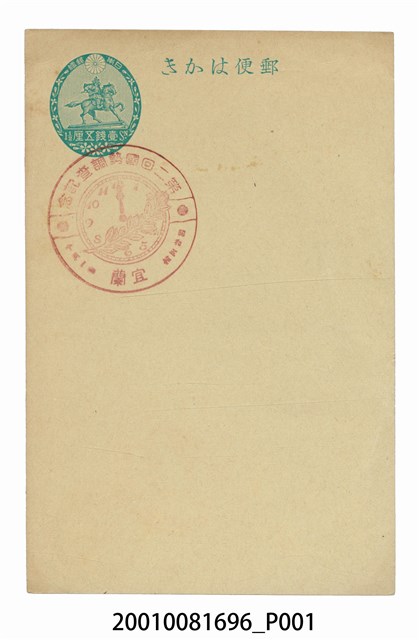1.本物件以國勢調查為主題,彩色樣式。正面左上角有一綠色橢圓形郵票處,該處有一戰士騎乘馬的圖像,且可見「日本郵票」、「壹錢五厘」等字樣。上方以漢字、平假名書寫之「郵便はがき」。明信片左上方有一紅色圓形戳章,有時鐘與一株植物之圖像。可見「第二回國事調查記念」、「宜蘭」、「昭和五年十月一日」等字樣。背面全部空白。2.國勢調查是針對人口異動及遷徙所作的人口普查。臺灣的第一次人口普查於1905年(明治38年),該次由於戰爭影響,僅在臺灣施行,稱為「臨時臺灣戶口調查」。日本政府第一次的國勢調查在1920年(大正9年)施行,之後每五年辦理一次。