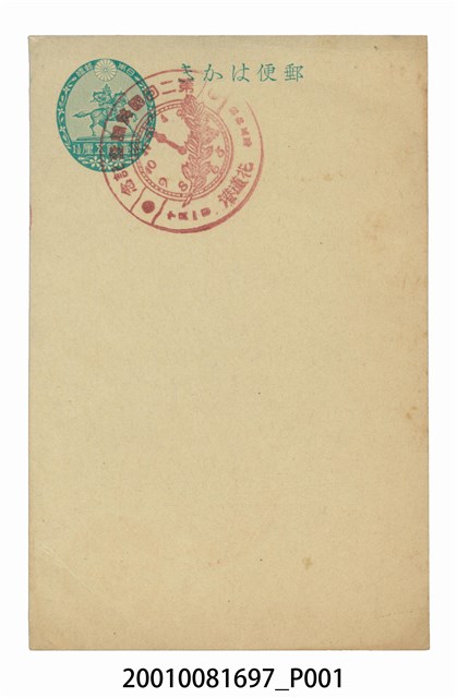1.本物件以國勢調查為主題,彩色樣式。正面左上角有一綠色橢圓形郵票處,該處有一戰士騎乘馬的圖像,且可見「日本郵票」、「壹錢五厘」等字樣。上方以漢字、平假名書寫之「郵便はがき」。明信片左上方有一紅色圓形戳章,有時鐘與一株植物之圖像。可見「第二回國事調查記念」、「花蓮港」、「昭和五年十月一日」等字樣。背面全部空白。2.國勢調查是針對人口異動及遷徙所作的人口普查。臺灣的第一次人口普查於1905年(明治38年),該次由於戰爭影響,僅在臺灣施行,稱為「臨時臺灣戶口調查」。日本政府第一次的國勢調查在1920年(大正9年)施行,之後每五年辦理一次。