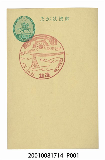 1. 本物件為蓋有臺灣電話開通紀念章之明信片。正面以綠色單色印刷,左上方印有1橢圓形圖樣,文字由上至下為「日本郵便」、「N.Sㄧ錢五厘1½」;圖樣由上至下為菊花,騎馬的武士,以及3朵櫻花;明信片上方有「郵便はがき」 ,中央偏左上位置蓋有一紅色圓形戳章,文字由上至下為「內台電話開通記念」、「昭和九年」(西元1934年 )、「高雄」、「六月二十日」,上方有轉盤電話機圖樣,中央為高壓電塔及電線插圖。背面全部空白。2. 日治時期臺灣電話的使用規定大致參照日本國內之規定;臺灣第一台電話於1897年架設,主要供軍隊及政府官員使用,直至西元1900年7月在臺北、臺中、臺南、基隆、斗六五地裝設電話交換機,開放市內電話業務,及民眾電話申請及開通。西元1932年遞信部為解決逐年增加的電話需求,以及已申請但未開通的部分,發布「臺灣電話特別開通規則」,以使用者付費的方式實行。