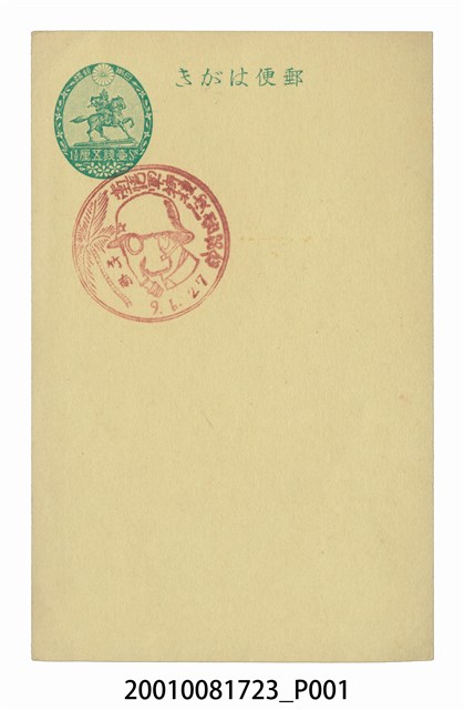1. 本物件為蓋有臺灣軍特種演習竹南紀念戳章之明信片,以綠色單色印刷,左上方印有1橢圓形圖樣,文字由上至下為「日本郵便」、「N.S壹錢五厘1½」;圖樣由上至下為菊花,穿著盔甲的騎馬武士,以及3朵櫻花;明信片上方有「郵便はがき」 ,中央偏左上位置蓋有1紅色圓形戳章,文字由右至左為「臺灣軍特種演習記念」、「9.6.27」(昭和9年6月27日)、「竹南」,戳章中央圖樣為1名戴著有星形標誌軍用鋼盔、臉上覆蓋有防毒面具之軍人側臉,左側有1棵棕櫚科植物;背面為一片空白。2. 臺灣防空知識的傳播及演習主要起始於第一次世界大戰後,西元1931年開始臺灣幾乎每年都有舉辦防空演習的訓練,而1934年6月24日至6月29日舉行的臺灣軍特種演習,為一次大規模演習,範圍涵蓋北臺灣,包含基隆、臺北、新竹等地,其演習內容分為3個部分:本演習、附帶演習、防護演習;本演習為臺北州與新竹州北臺灣軍的共同操演,附帶演習為軍隊的實彈射擊訓練,防護演習則與民眾較具有直接關聯,包含警報傳達及防護演習等。