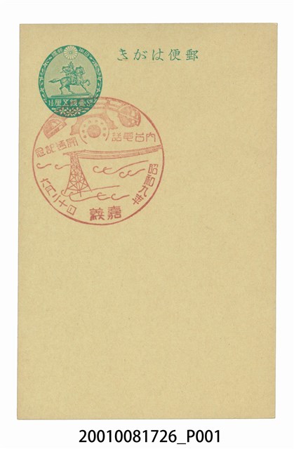 1. 本物件為蓋有臺灣電話開通紀念章之明信片。正面以綠色單色印刷,左上方印有1橢圓形圖樣,文字由上至下為「日本郵便」、「N.Sㄧ錢五厘1½」;圖樣由上至下為菊花,騎馬的武士,以及3朵櫻花;明信片上方有「郵便はがき」 ,中央偏左上位置蓋有一紅色圓形戳章,文字由上至下為「內台電話開通記念」、「昭和九年」(西元1934年 )、「嘉義」、「六月二十日」,上方有轉盤電話機圖樣,中央為高壓電塔及電線插圖。背面全部空白。2. 日治時期臺灣電話的使用規定大致參照日本國內之規定;臺灣第一台電話於1897年架設,主要供軍隊及政府官員使用,直至西元1900年7月在臺北、臺中、臺南、基隆、斗六五地裝設電話交換機,開放市內電話業務,及民眾電話申請及開通。西元1932年遞信部為解決逐年增加的電話需求,以及已申請但未開通的部分,發布「臺灣電話特別開通規則」,以使用者付費的方式實行。