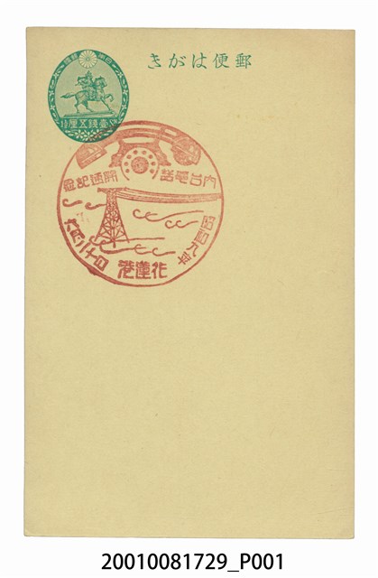 1. 本物件為蓋有臺灣電話開通紀念章之明信片。正面以綠色單色印刷,左上方印有1橢圓形圖樣,文字由上至下為「日本郵便」、「N.Sㄧ錢五厘1½」;圖樣由上至下為菊花,騎馬的武士,以及3朵櫻花;明信片上方有「郵便はがき」 ,中央偏左上位置蓋有一紅色圓形戳章,文字由上至下為「內台電話開通記念」、「昭和九年」(西元1934年 )、「花蓮港」、「六月二十日」,上方有轉盤電話機圖樣,中央為高壓電塔及電線插圖。背面全部空白。2. 日治時期臺灣電話的使用規定大致參照日本國內之規定;臺灣第一台電話於1897年架設,主要供軍隊及政府官員使用,直至西元1900年7月在臺北、臺中、臺南、基隆、斗六五地裝設電話交換機,開放市內電話業務,及民眾電話申請及開通。花蓮港郵便局於西元1899年設立,並於西元1928年開始無線電通信業務,其位置於西元1930年位於中正路及中山路口,原建築已不在。