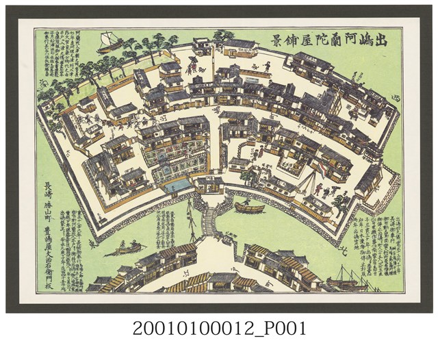 1. 本物件為彩色版畫,版畫內容記錄當時阿蘭陀人(荷蘭人)於出嶋町(出島,日本長崎的人工島)房屋店鋪的位置圖,圖中可由落款看出為「豊嶋屋文字右衛門」製版。