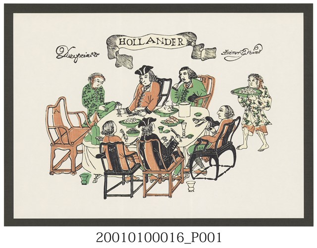 1. 本物件為彩色版畫,色彩為黑、橘、綠三色,畫面呈現荷蘭人用餐之景色。2. 長崎版畫為日本江戶中期至明治時期所流行的浮世繪,長崎作為日本鎖國時期唯一的對外港口,此地區因獨特的生活環境而衍生出「長崎版畫」或「長崎繪」。此類畫作特色為主題的題材多為描繪當時被限制居住於出島的荷蘭人與中國清朝人,表現其生活狀況。長崎版畫的畫風與江戶地區的浮世繪不同,其受蘇州版畫與西洋畫影響較深。此時期的畫作於現在不論是歷史或是美術方面皆為重要的資料。