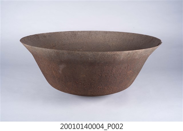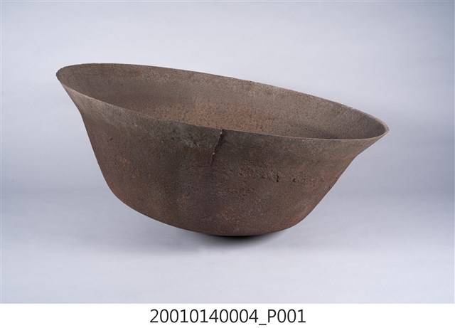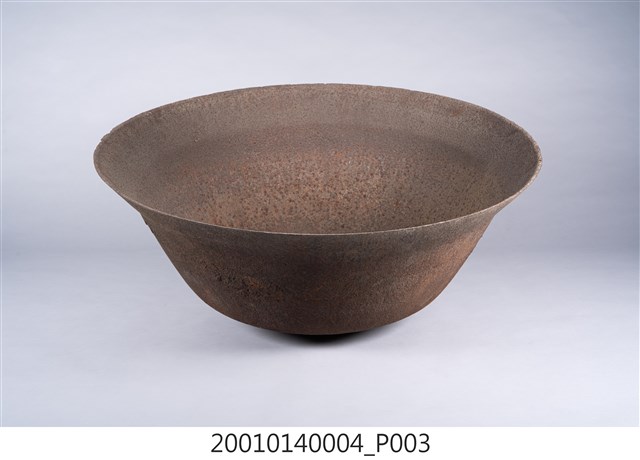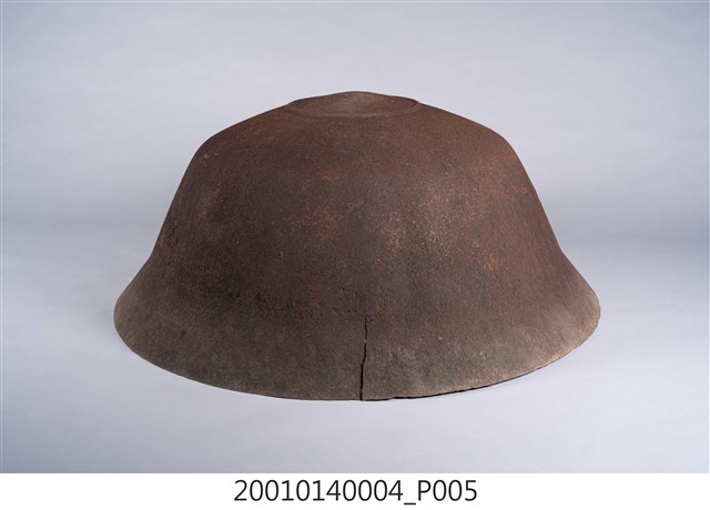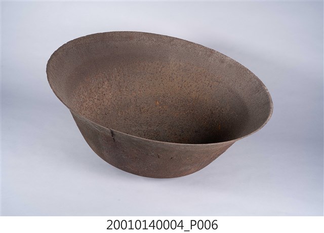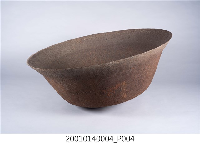 1.本物件為糖鐵鍋,約略呈現倒放的帽子形狀,鐵鍋內外均略有鏽斑,外型保存尚稱完整。 2.甘蔗榨汁後收集蔗汁再行加工,以提煉純度較高的糖,並且去除雜質。可用糖鐵鍋進行蒸煮,燃料則使用乾燥的甘蔗渣和木材。