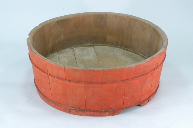 1.本件木製朱漆洗腳桶,又稱腳桶。通身以木板拼接製作而成,外型呈圓形桶狀,口部作直口,器身略呈上寬下窄,並帶有兩道鐵線圈箍兼具固定與保持密合桶身板材。底緣處等距切削3個倒梯形開口,使底足呈現3道板足支撐。其外觀於桶身表面漆有紅色顏料,內面則呈木材原色。2.洗腳桶主要用於清洗腳部或清洗衣物之用。表面漆有紅色顏料的洗腳桶為嫁妝之一,常與腰桶、溲桶(又分為屎桶與尿桶)合稱之為子孫桶或四色桶。為女方嫁妝(尾擔)所需物品,腰桶平時為婦女沐浴之用,生產時為作生子盆使用。腳桶平時用來洗衣、洗腳,生產時可用來清洗嬰兒。溲桶平時是便器,生產時用來放置產後穢物。因此子孫桶又帶有子孫繁衍的寓意。