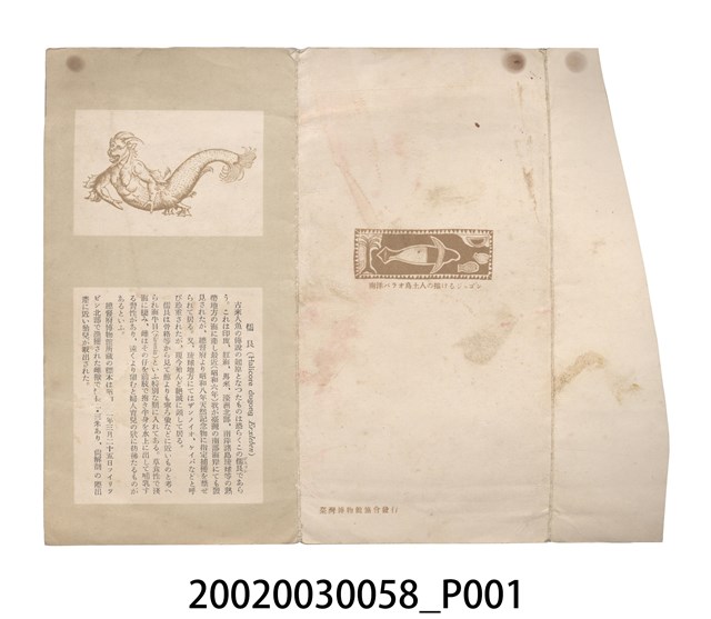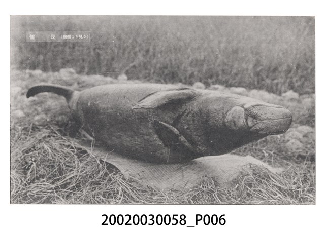 1.本件儒艮人魚圖文說明板為長方形直式,底部為淡黃緣色,分為上圖、下文,上圖為手繪儒艮圖,下文為直式書寫的標題「儒艮(Halicore dugong)」及2段說明文字,外觀呈現泛黃,保存良好。