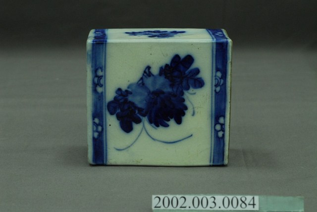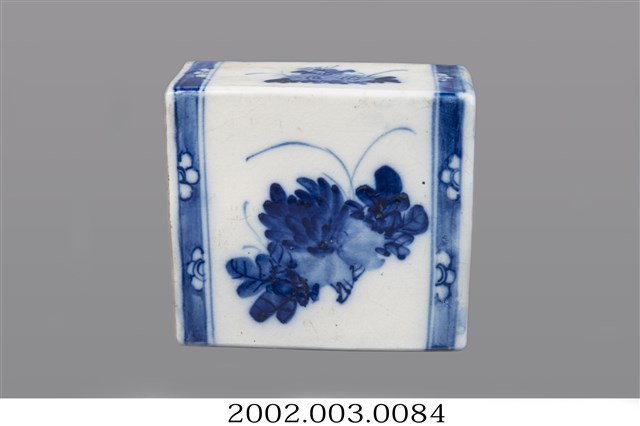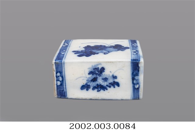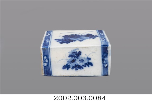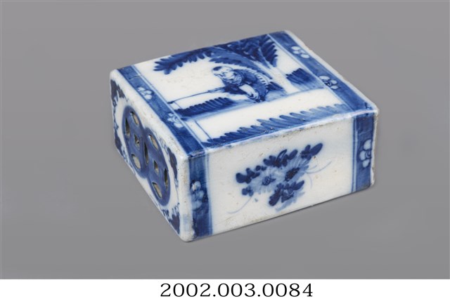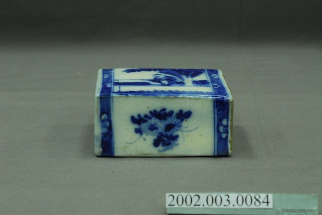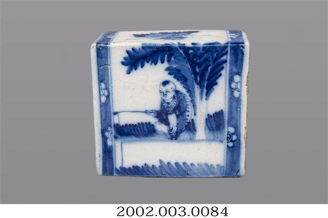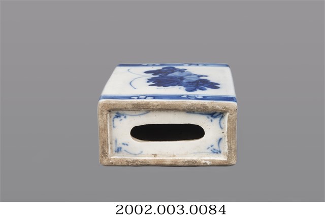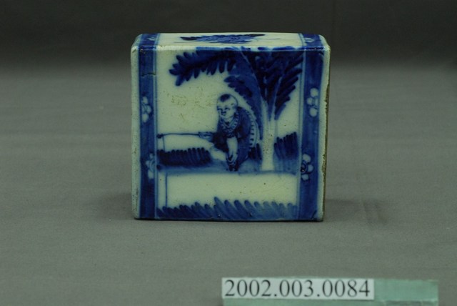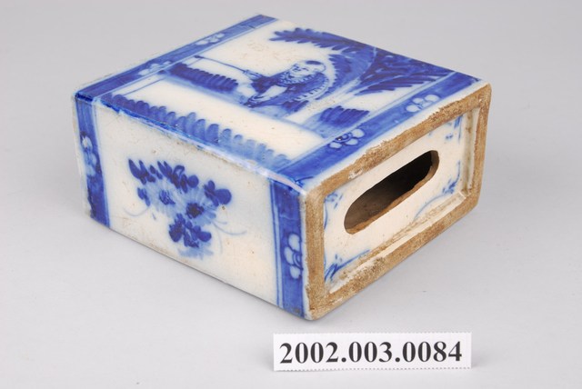 手繪白瓷青花樹下垂釣圖箱形枕呈較扁的正方形,邊角相連處觸手圓潤,造型規整。全器施白釉,青花發色較淺,略有不均。四面枕面兩端以藍地白花的方式繪製錯落有致的半朵三瓣式花朵裝飾帶,藍地釉色較不均勻,仍可見筆觸痕跡。正方形枕面繪一在芭蕉樹下垂釣的童子形象,童子以簡單幾筆繪出輪廓,以藍釉填色、並以不同的線條粗細暗示衣服紋理。除了童子以較多變化的筆觸完成外,身後的芭蕉樹、水塘周圍的草地,皆以同種筆畫完成,較粗且短的線條重複堆疊,使得畫面一致,更有古樸意趣。其餘枕面皆以相似的花草結組而成,多至於畫面中央,簡潔大方。