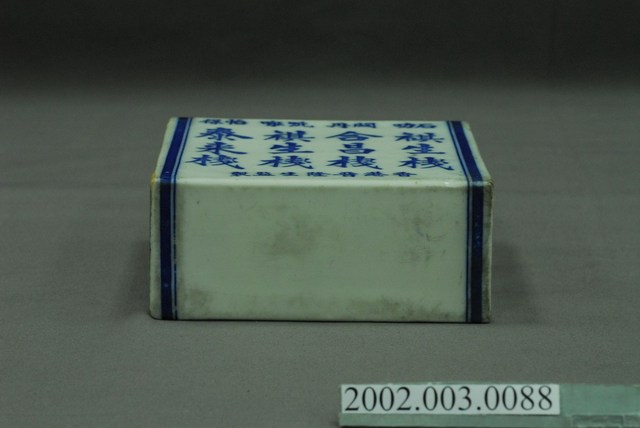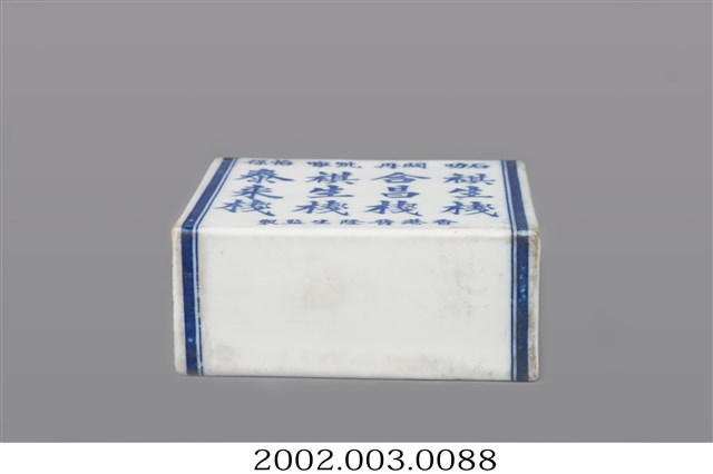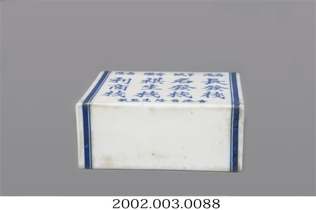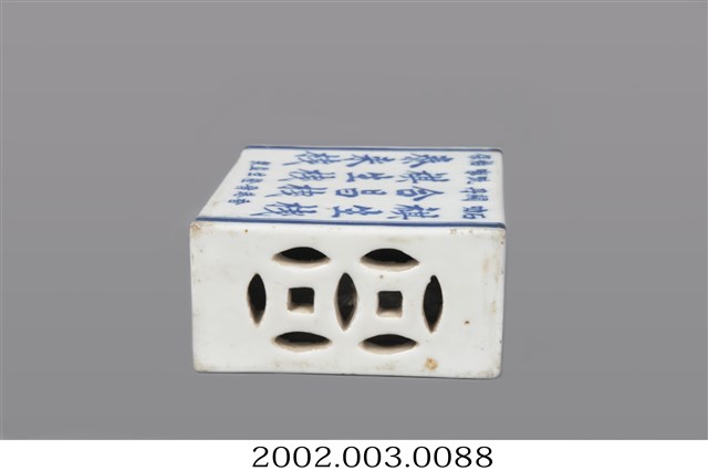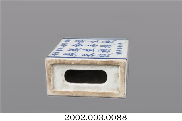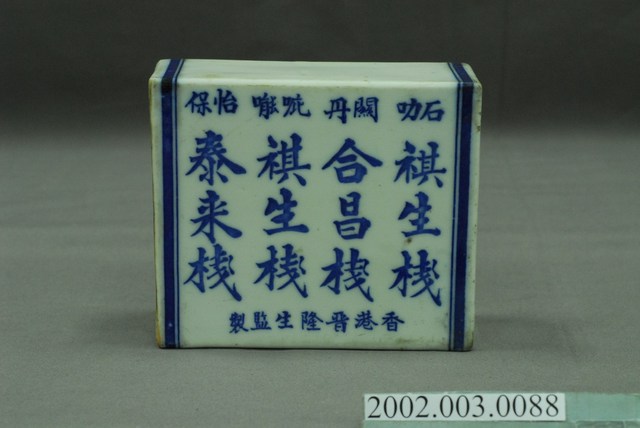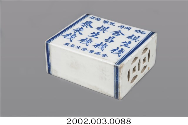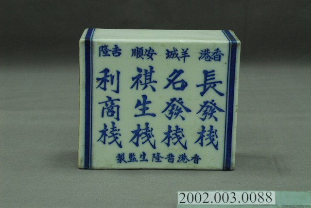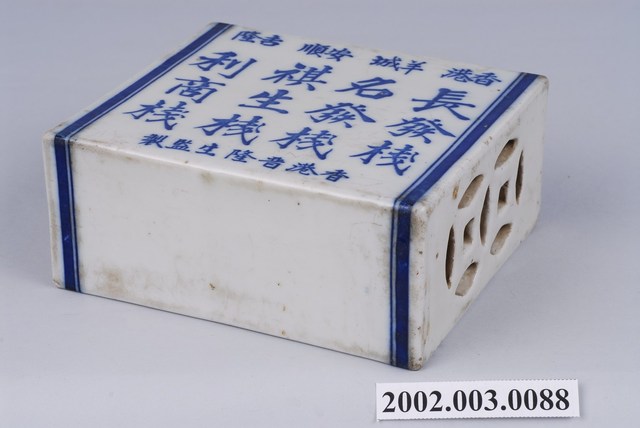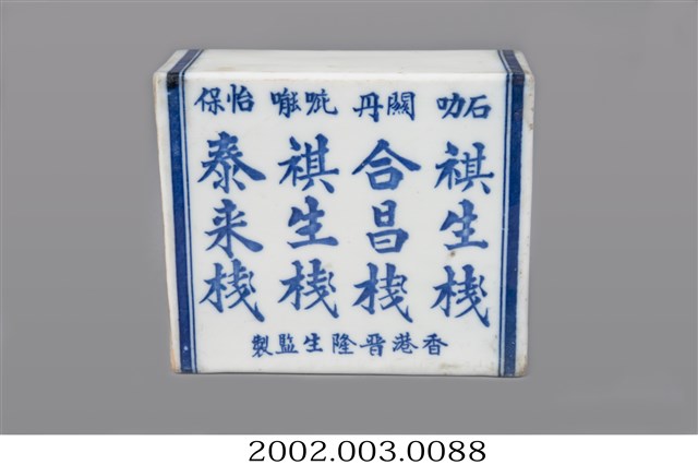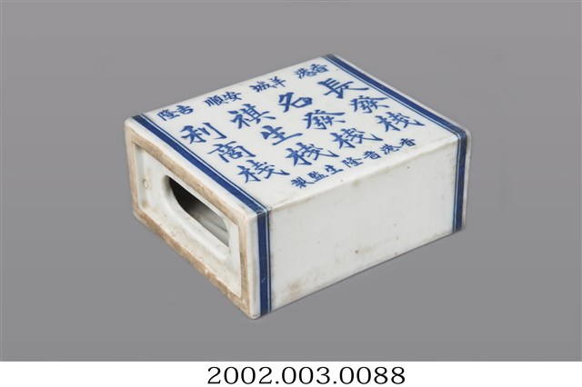 1. 轉印白瓷青花腕枕呈較扁的正方形,邊角相連處觸手圓潤,造型規整。全器施白釉,釉色瑩潤潔白。枕上以隸書書寫垂直排列的大字樣,枕面下方印有「香港晉隆生監製」字樣,應是香港多家商行一同燒製。2. 瓷枕的用途並非皆作為傢俱使用,還包含其他種功能。以箱形枕來說,有些枕頭形式則具有禮儀性質,用以作為紀念性、宣傳性的禮物,可以攜帶在身上作為送禮用。