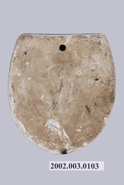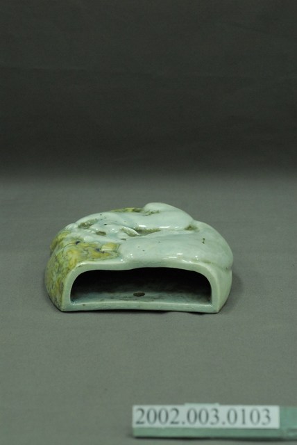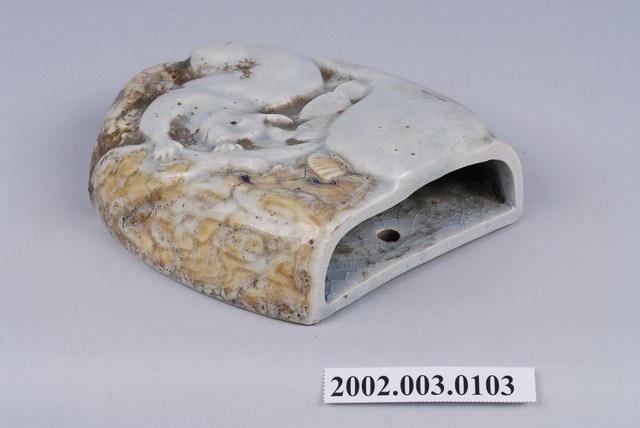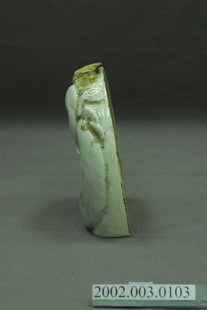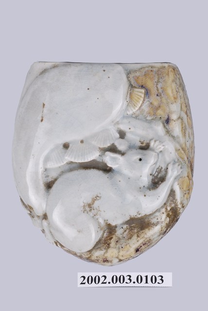 1.本件白瓷松鼠壁花插,以淺褐色瓷土為胎體,除背面之外,其餘皆施白色化妝土與透明釉經過高溫燒製而成,表面滿佈因燒製溫度造成釉面收縮之冰裂紋開片,右半部因入沁帶有褐色。外型呈扁狀盾形,頂面開口,正面浮雕松鼠側面全身像,松鼠尾部豐大,雙前肢撫於樹枝,憩停於松樹樹稍之上,松樹葉以扇形貼花裝飾。壁花插背面銘刻有「白身鼠松」草書4字。2.壁花插又稱轎瓶、壁瓶、半瓶,為明清開始流行的裝飾品。原為達官貴人使用,因應轎內空間較為狹小,而出現剖半樣式之裝飾品,後來廣泛用於居家裝飾,可懸掛於牆面或床柱等。