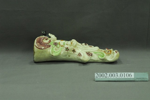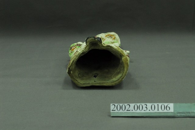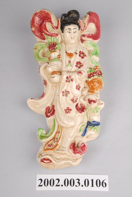 本文物為立體陶瓷仙女壁插,最下方為插孔,為裝飾建築物之用。該仙女右手持一裝有花之花瓶,左方有一頂著盆器的猴子,仙女身穿白色底紅色花朵點綴之上衣,裝飾著綠色和紅色的披肩。