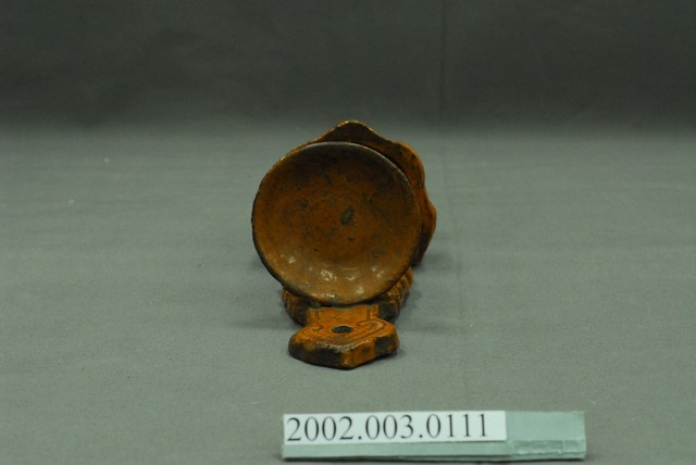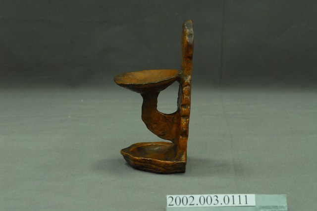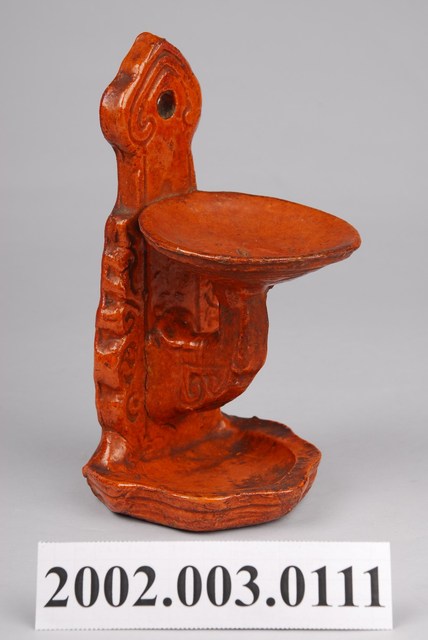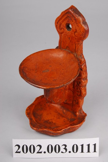 本件壁掛式磚胎油燈以陶土製作而成,為上下雙承盤樣式,器表為紅磚色澤,表面施以透明玻璃釉燒製而成。油燈外形呈現倒F字形,垂直長條形陶板,上端作尖狀如意雲頭,並鑽有圓形孔洞,可直接壁掛於牆上,兩身側以雲紋裝飾。底端作直角半圓承盤,上端承盤以陶板延伸出的L形架支撐,表面作回字紋。上承盤為圓形圜底淺碟,用以放置燈油與燈芯燃燒照明。