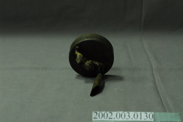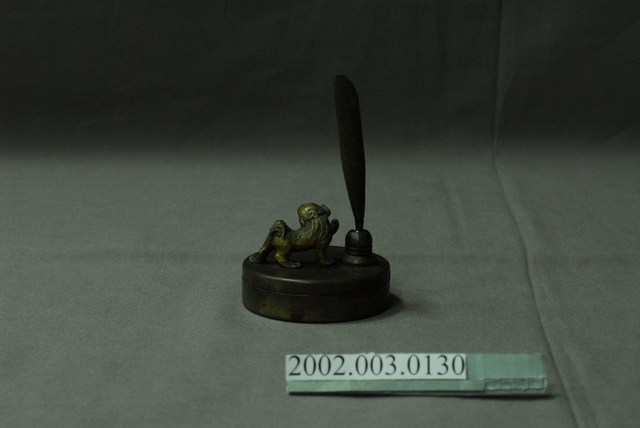 本文物可分為兩層,上層為置筆處,下層為放置印泥處,應為銅製。整體顏色為咖啡色。置筆處旁有一小獅裝飾。
