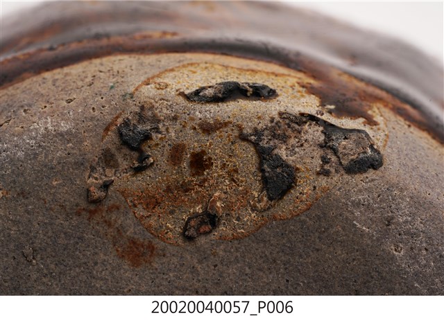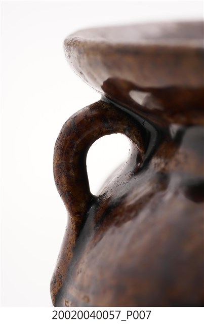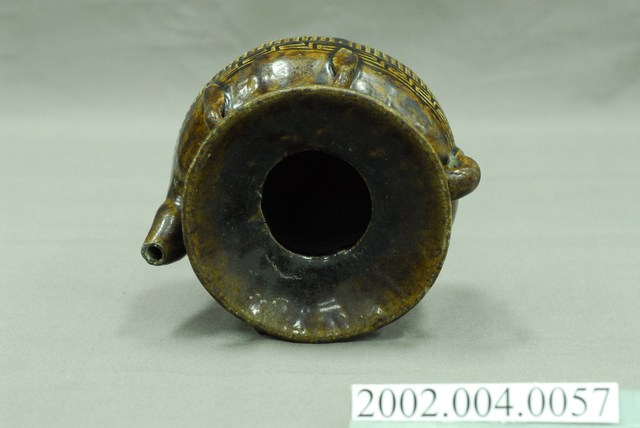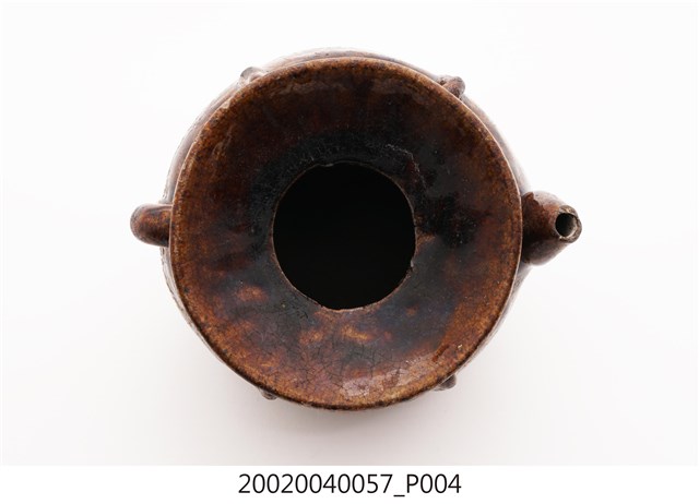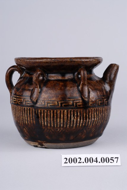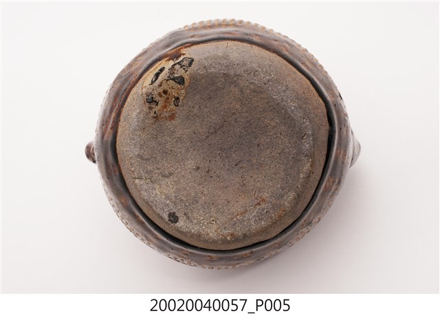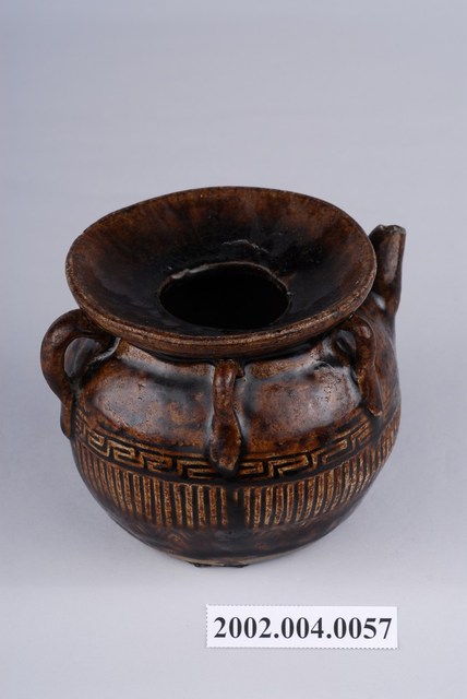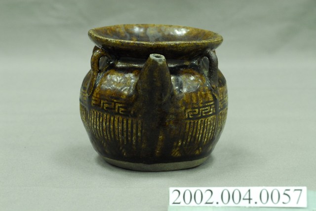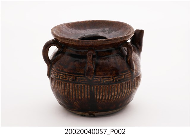 1.本件黑釉五梅油壺以陶瓷胎體於表面施以黑褐釉燒製而成,其底緣與底面不施釉。外型呈現外侈盤形口緣,束頸,球形鼓腹身,平底盛器,器身帶有1流嘴,自頸部帶有5個C形繫耳。從器身中段開始以回字連續紋下接緊密的垂直線形紋,於器身底為三角波浪紋裝飾。2.本件油壺為添加燈油於燈盞使用,一般植物燈油多以罐盛裝,因此會分裝至油壺後,再以油壺的流嘴注入油燈。此形制帶有5繫耳,又稱五梅油壺,也可做為婦女裝盛燻油,梳妝護髮使用。此外另有較為小型之油壺也可於流嘴塞入燈芯後,直接做油燈使用。