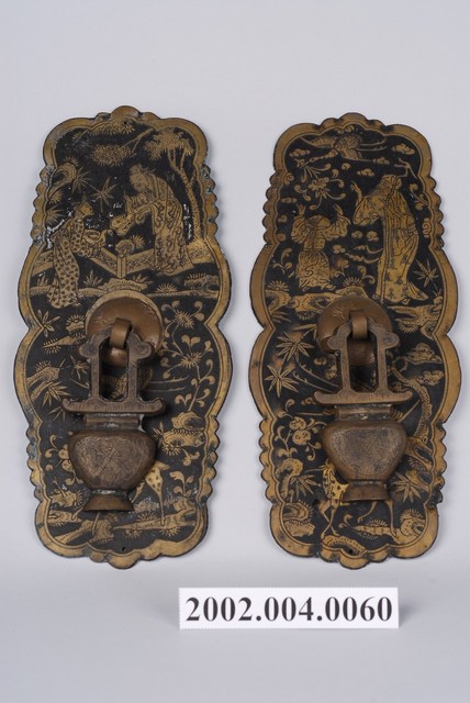 本件文物為櫥櫃的把手,一組兩件為一對,用於木櫃門上。中國大陸稱櫥櫃把手為拉手。由背面銅綠推測材質為銅。把手由長條銅片、圓鈕釘與花瓶形墜組成,銅片上有小釘孔,以釘入木櫃門,圓鈕釘後方帶兩片針腳,以穿過櫃門孔洞後固定,花瓶形墜則為手拉之處。銅片正面為黑底金色,圖案為傳統吉祥圖案,上方視覺焦點為人物故事,周圍以吉祥花草、動物、瓜果等,線條精細。以花瓶形為墜,則為當時此類五金常見的圖案作法。本組把手為中國大陸1910年代到1940年代出現的櫥櫃把手風格,推測本件文物原應來自中國大陸,因銅金色稍褪色,推測可能為早期製品,但亦可能為仿古製作。