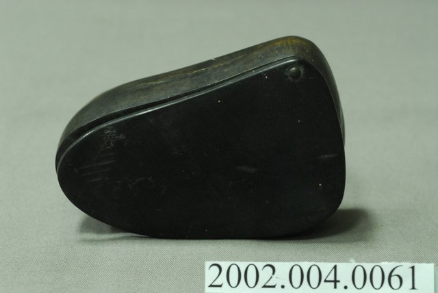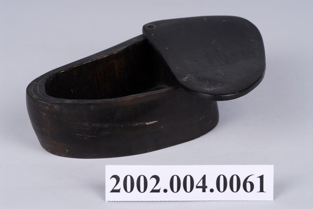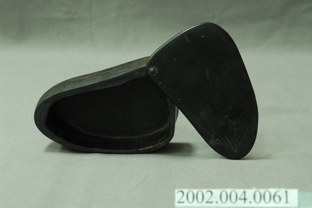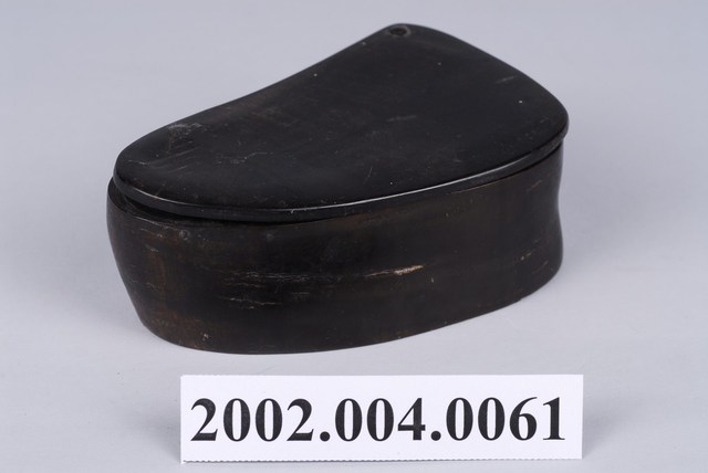 1.本件附蓋牛角盒可分為盒蓋與盒身2部件,通身以牛角製作,外觀為黑色素面,外型呈現近三角形盒體。盒身以牛角一體成形製作,內部挖空作槽狀。盒蓋為扁平蓋狀,盒蓋一側利用鐵釘將其固定於盒身,以鐵釘為軸心,左右推動開闔。2.本件牛角盒可作收納小型物品的盛盒使用,如珠寶盒、工具盒等,用途廣泛,視使用情況而定。傳統收納盒多使用竹、木、角骨類,晚近年代更出現金屬材質。角骨類多利用天然形成的造型,經過簡單加工即可完成製作。
