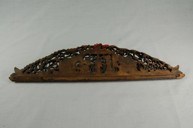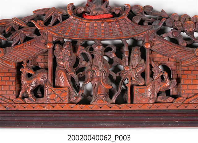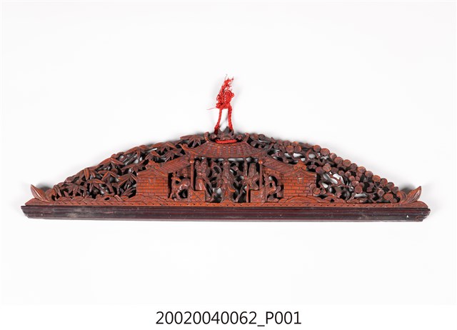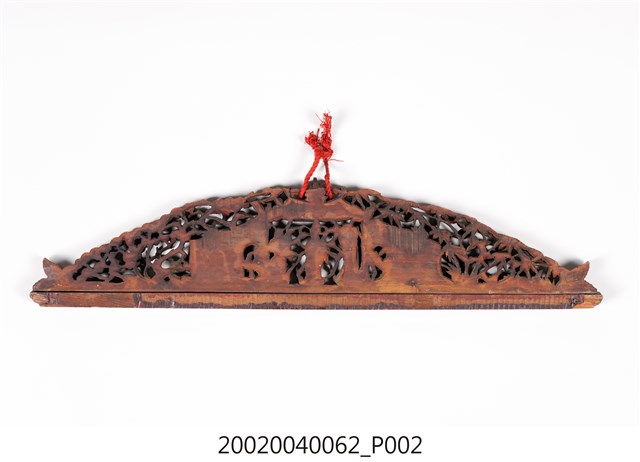 1. 本藏品為透雕木飾件,下平上圓,底部有一長條底板。底板上為一半圓形鏤空透雕主體,細節上以一個傳統三合院住宅為中心,合院正廳中刻有代表福祿壽的三仙,左側為手抱嬰兒的祿星,中央為手持如意的福星,右側則為拄著柺杖的壽星,分別象徵著功名、財富、長壽。合院周圍則透雕有松柏植物,同樣有長壽的吉祥意味。此件通體施以乾漆,應屬於日治時期之後的作品。2. 此類半圓形的雕刻裝飾構件,多用於家具的頂端,常見於傳統的神龕、公媽龕、洗面架之上。