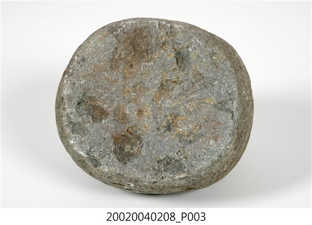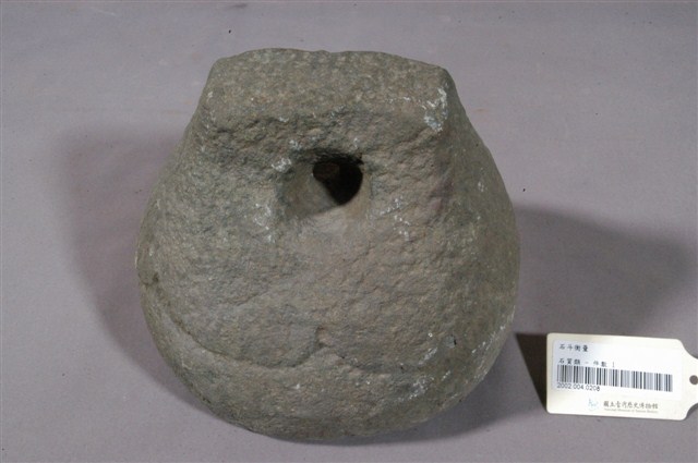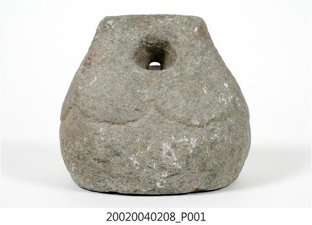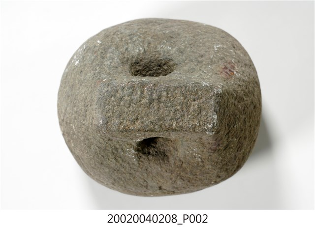 1.本物件為石製度量衡器,又稱石砣,類砝碼用途,上有洞可穿繩。 2.早期臺灣各地郊行(同業公會)為標榜公平信用,多備有公認石砣,尤其經營米、鹽、糖等大宗貨物交易的行號,通常會在石砣鐫刻行郊名、物料別和重量,其形多為上窄下寬、豎立長方塊,在上方鑽鑿一孔穿繩,依大小由二人或數人稱(秤)量交易取信。