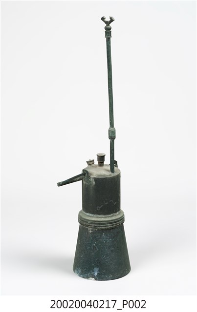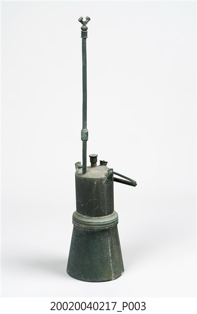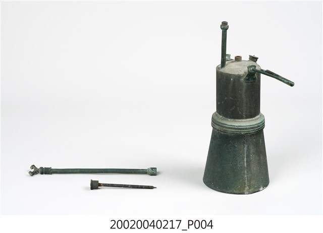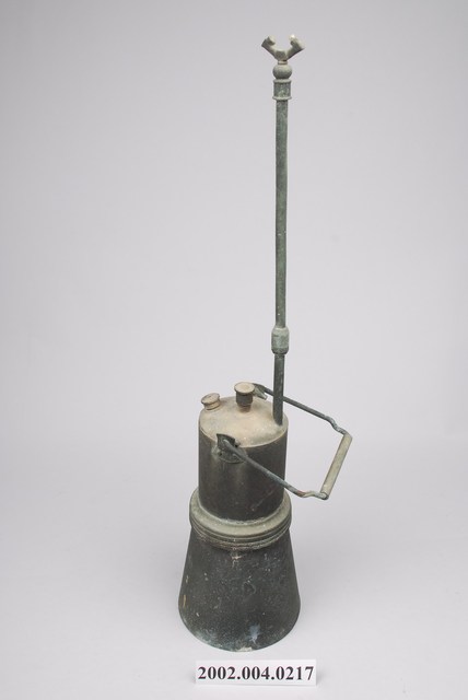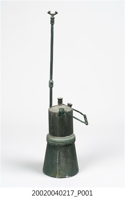 錏鉛製長桿電石燈組以錏鉛板焊合製成,分為座身、水流調節桿、燈桿共3組件。臺灣早期在電燈尚未普遍的時代,係以油燈、蠟燭、電石等做為夜間照明工具。本件電石燈係以下座放置電石,又稱電土,為碳化鈣(CaC2),上座盛水,因水接觸到電土會釋放乙炔氣體,於噴火嘴點燃可做照明之用,透過上座電石燈與油燈、蠟燭相比照明度較亮,且具有防風的特性,因此多使用於夜間戶外,如農民巡田水、捕捉鱔魚青蛙、皮影戲、出海捕魚等用途。