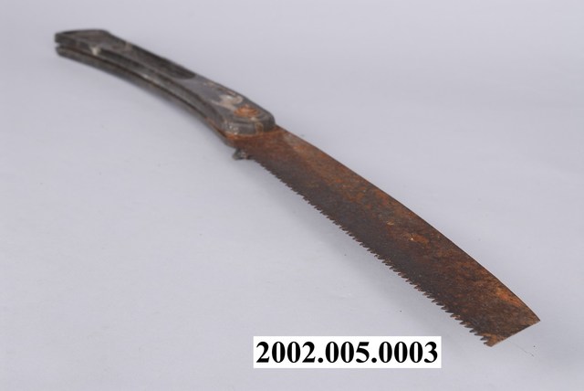 本文物為折合鋸,是木工的工具,為1970年代以後臺灣的工具店發展出來的鋸子種類,非臺灣傳統鋸。鋸條的鋸齒面可收折進握柄中,便於攜帶,故稱折合鋸。鋸是木工用以切割木料的工具,本件鋸以鐵鋸片和塑膠握柄組成。鋸刃長27公分,後端以螺絲與塑膠長條握柄固定。本件鋸柄上有製造商名稱「來發興業有限公司」、「LYE-FAR ENTERPRISE CO., LTD」,品牌名稱「野牛」文字及野牛圖案。