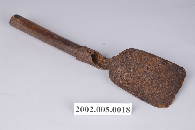 本文物為秧鏟,為1980年代農機普及前種植水稻常用的農具,以平口鐵鏟片與竹柄構成。鐵鏟片後端連接鐵棒,再接收捲成圓筒形箍以供置入柄,為漢人傳統農具作法,從清末至今未變。秧鏟有長柄、短柄不同,本件為短柄,通常用於水稻田或菜園。在水稻的秧苗培植至約三寸高時,需移栽到水田中。移植時,使用秧鏟將整片秧苗由秧田連根帶土成片鏟起,放置於秧披內。菜園亦於移植菜苗時使用。