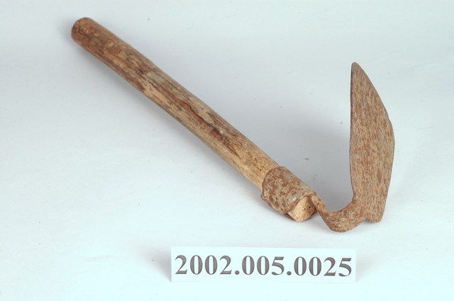 本文物為鋤頭,為過去至今稻田、菜園、園藝常用的農具,以鐵製鋤頭與木柄構成。鋤頭為前端為平口,後端收為箍以置木柄。鋤頭柄有長柄、短柄之分,本件為短柄的鋤頭。鋤頭使用時可以其口薄挖土面,或以其面盛少量土移動,用途廣泛,包括翻土、整畦、除草、處理堆肥、蓋土、收穫、整理水溝等。本件鋤頭鐵件為白鐵,為1980年代以後使用材料。